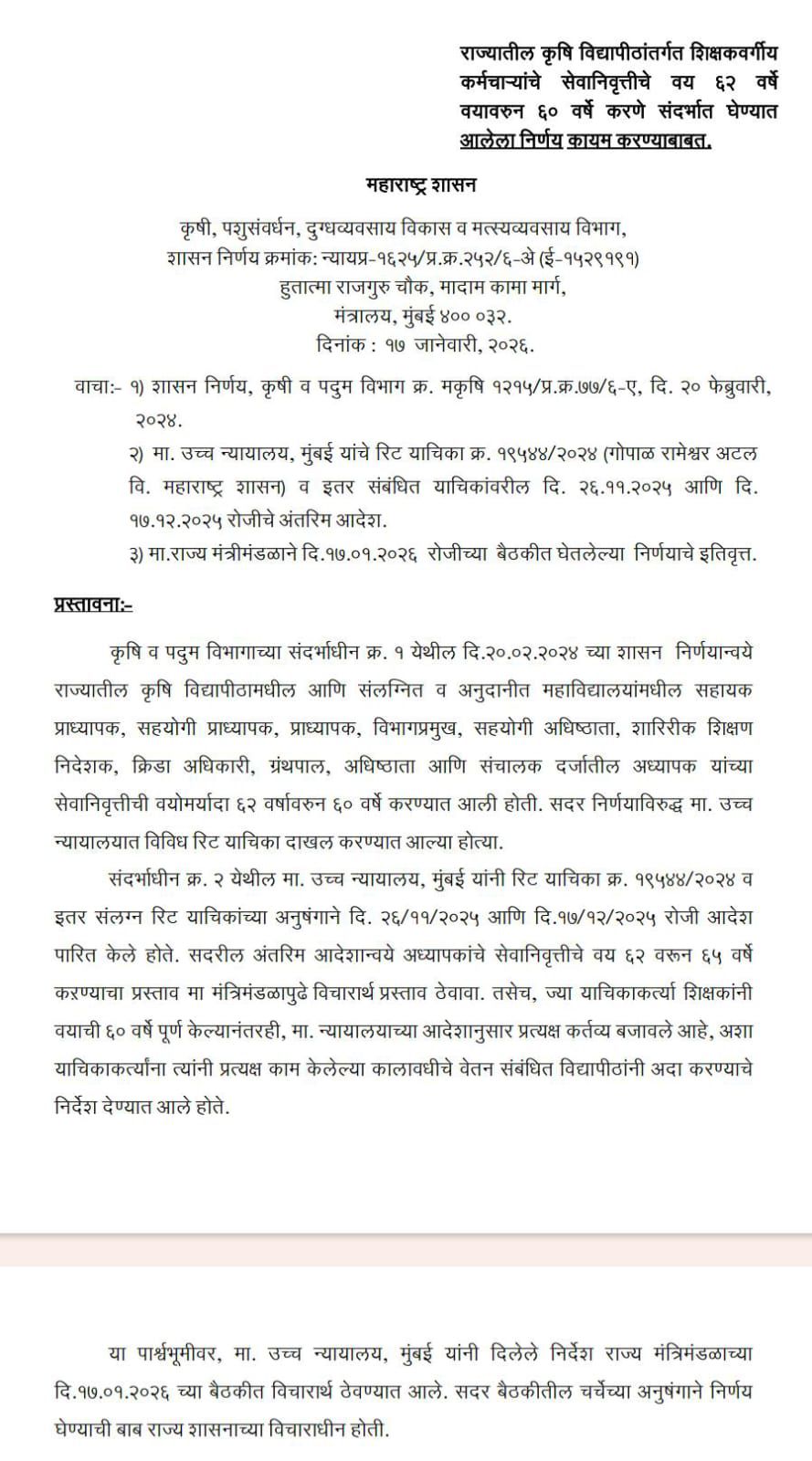 हा शासन निर्णय कृषी विद्यापीठांमधील अध्यापकीय कर्मचाऱ्यांसाठी महत्त्वाचा ठरला असून, सेवानिवृत्ती व त्यानंतरच्या वेतन व सेवा लाभांबाबत निर्माण झालेला संभ्रम दूर होण्यास मदत होणार आहे. Retirement Age Reduction News
