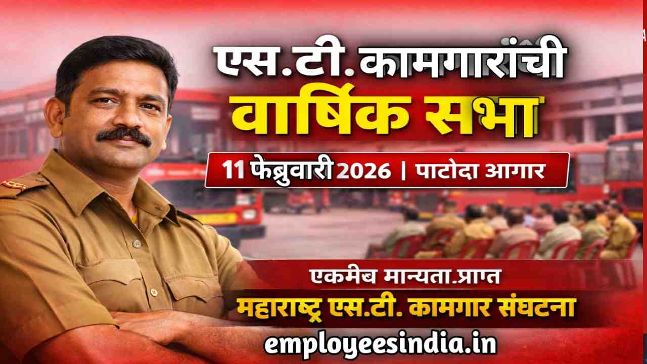 पाटोदा : ST Employees News : एकमेव मान्यता प्राप्त महाराष्ट्र एस.टी. कामगार संघटना, पाटोदा आगाराची सन 2026-27 साठीची वार्षिक सर्वसाधारण सभा बुधवार, दि. 11 फेब्रुवारी रोजी दुपारी 12 वाजता पाटोदा आगार येथे आयोजित करण्यात आली आहे.  या बैठकीमध्ये वार्षिक कार्यकारिणी जाहीर करण्यात येणार असल्याचे सांगण्यात येत आहे .