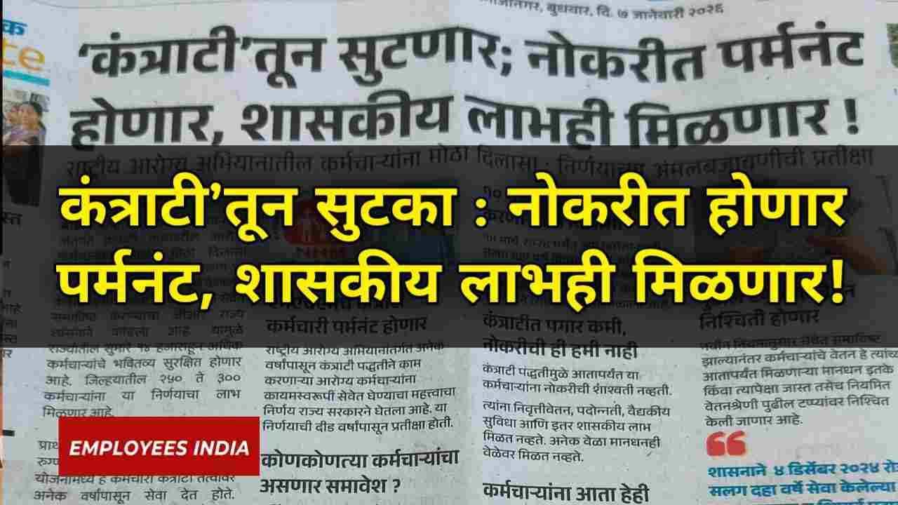 Contract Employees Permanent :  नमस्कार मित्रानो राज्यातील राष्ट्रीय आरोग्य अभियान (NHM) अंतर्गत कंत्राटी पद्धतीने कार्यरत असलेल्या कर्मचाऱ्यांसाठी ही अत्यंत दिलासादायक बातमी आहे. दीर्घकाळापासून सेवेत असलेल्या कंत्राटी कर्मचाऱ्यांना आता कायमस्वरूपी (Permanent) सेवेत सामावून घेण्याचा महत्त्वपूर्ण निर्णय राज्य शासनाने घेतला आहे. NHM Employees Permanent Job १० वर्षांहून अधिक सेवा करणाऱ्यांना मोठा दिलासा राष्ट्रीय आरोग्य अभियानांतर्गत अनेक कर्मचारी … Read more