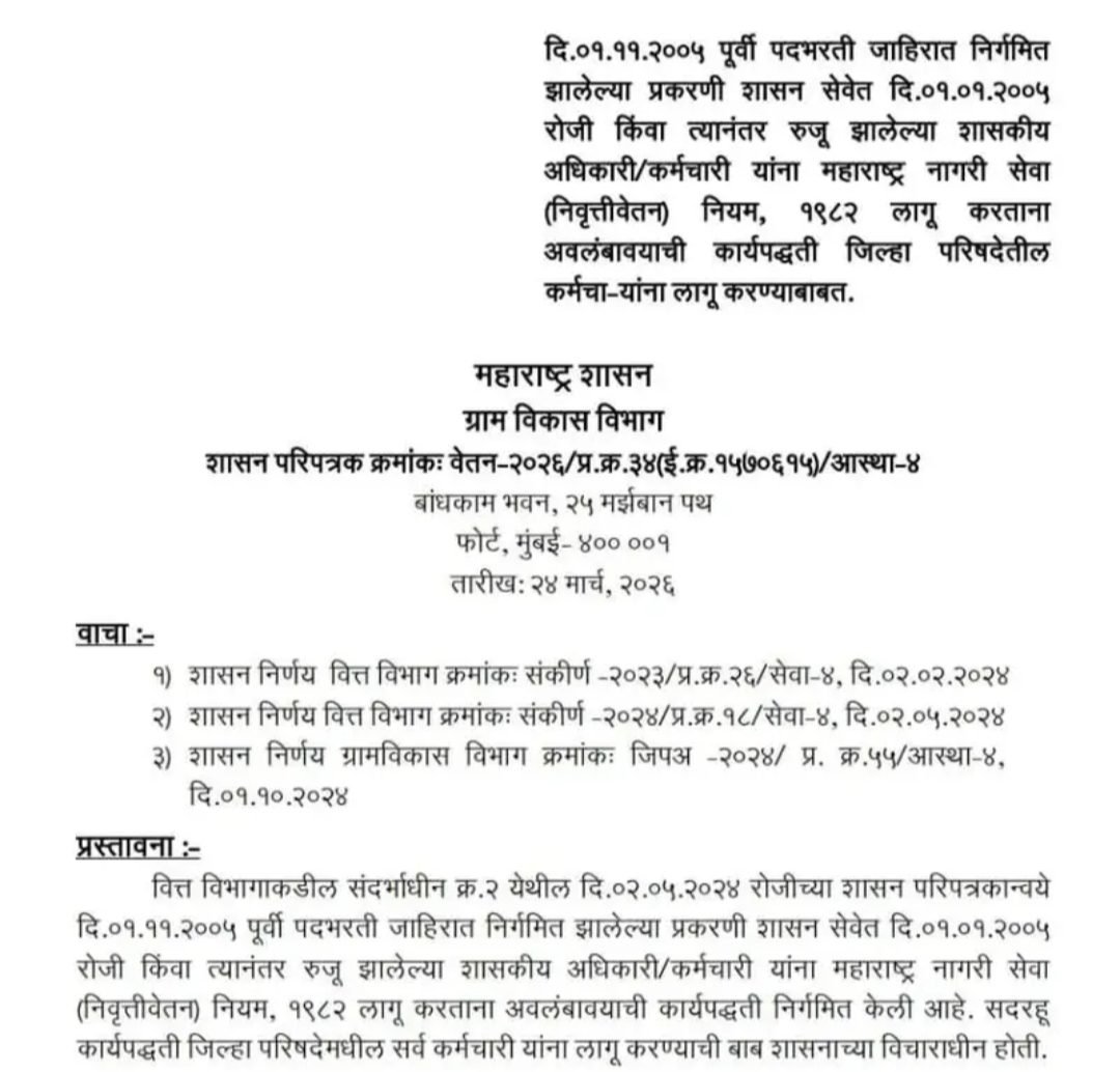 मुंबई | प्रतिनिधी : Maharashtra Pension Rules 1982 Update : राज्यातील जिल्हा परिषद कर्मचाऱ्यांसाठी अत्यंत महत्त्वाचा आणि दिलासादायक निर्णय जाहीर करण्यात आला आहे. ग्राम विकास विभागाकडून दिनांक 24 मार्च 2026 रोजी शासन निर्णय (GR) निर्गमित करण्यात आला असून, यामध्ये निवृत्तीवेतनासंदर्भात महत्त्वाच्या सूचना देण्यात आल्या आहेत.