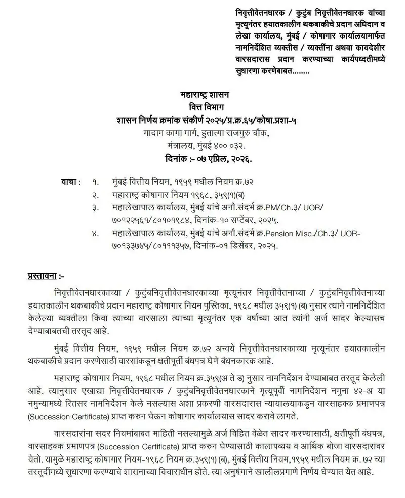 मुंबई :  Pension Arrears Rules Change :  राज्यातील निवृत्त कर्मचारी आणि त्यांच्या कुटुंबीयांसाठी दिलासादायक बातमी समोर आली आहे. वित्त विभागामार्फत दि. 07 एप्रिल 2026 रोजी निर्गमित करण्यात आलेल्या महत्त्वपूर्ण शासन निर्णयानुसार, निवृत्तीवेतन व कुटुंब निवृत्तीवेतन देण्याच्या कार्यपद्धतीत मोठी सुधारणा करण्यात आली आहे.